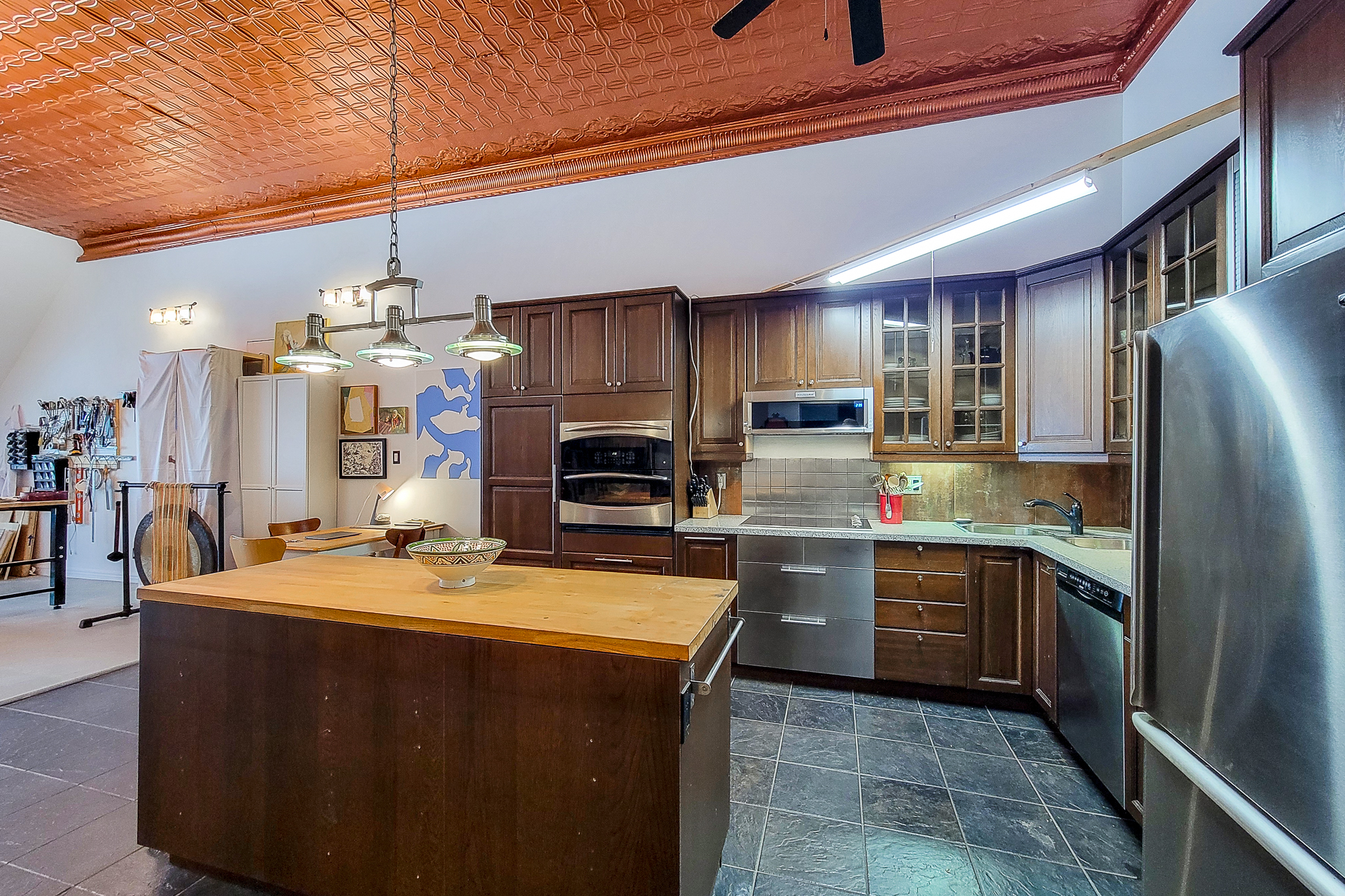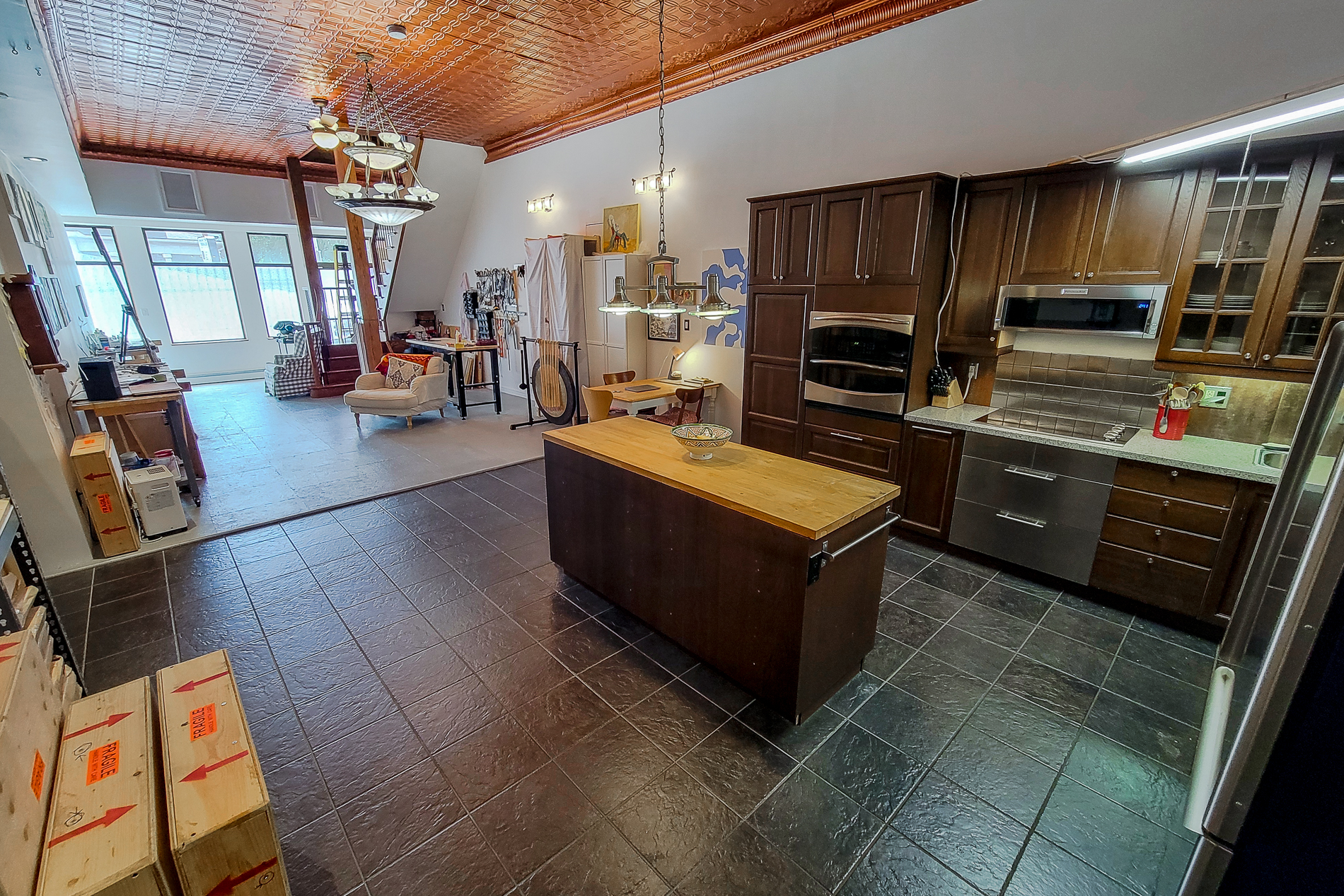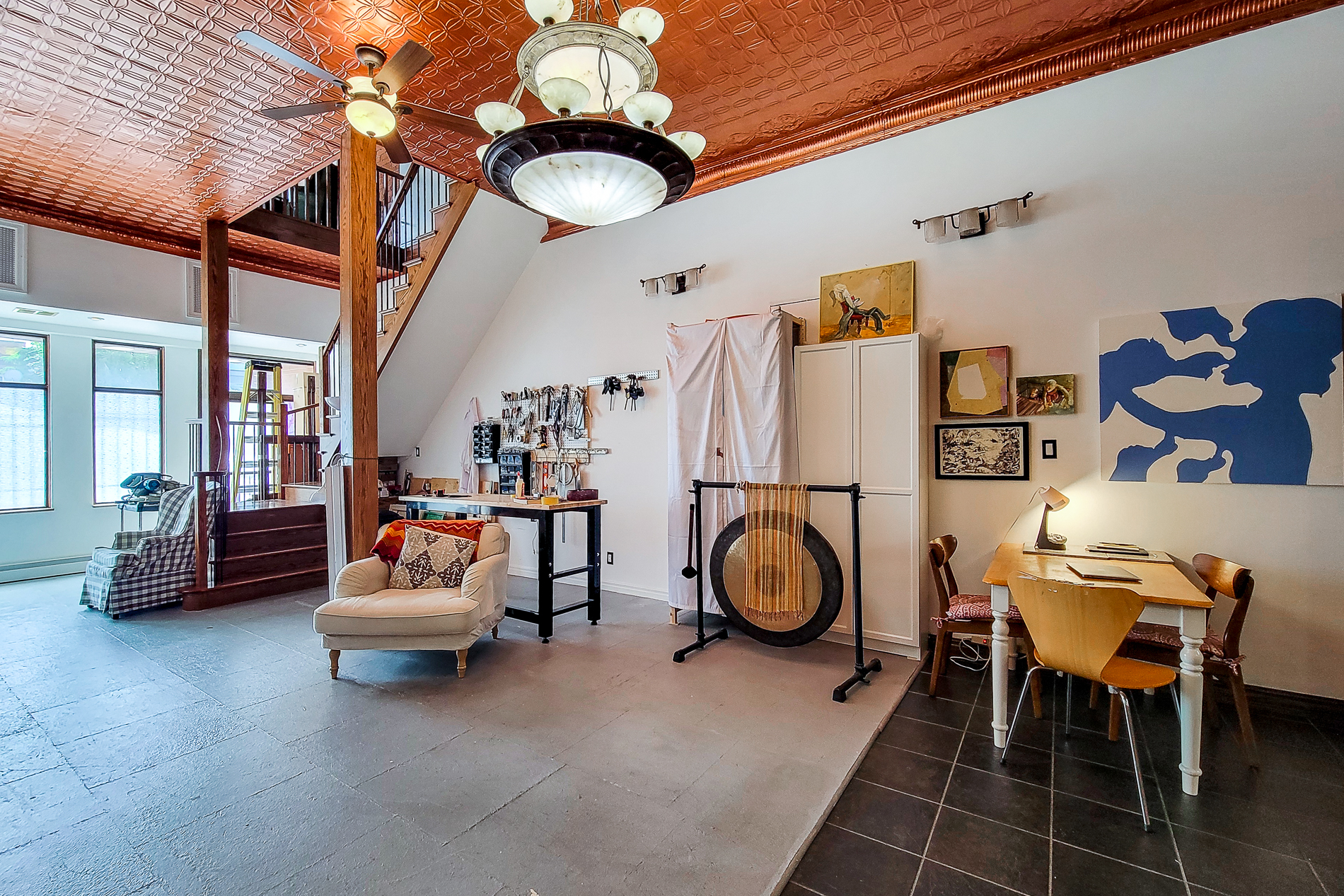 Mixed use office / retail / residential unit property for sale in Hamilton. Live, work, and invest at 593—595 King Street East. This mixed-use downtown property offers 3 units with 5 parking spaces along the future LRT corridor. The spacious 3,223 SF live-work unit with rooftop deck, full basement, and original bank vault will be vacant on closing, ideal for an owner-occupier or conversion back to commercial use. Additional income comes from a long-standing barbershop and a beautifully maintained 1-bedroom apartment with quality tenants. Unique character features include pressed-metal ceilings and turn-of-the-century details. Flexible zoning, ample power, and prime location make this a rare Hamilton opportunity. || TOTAL PARKING SPACES: 5 ||